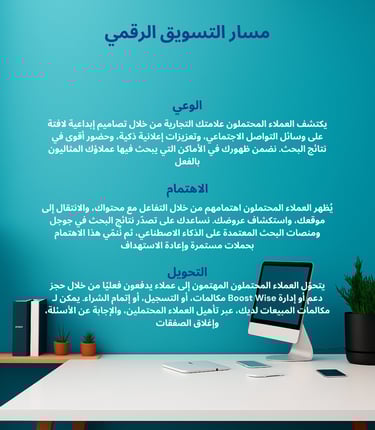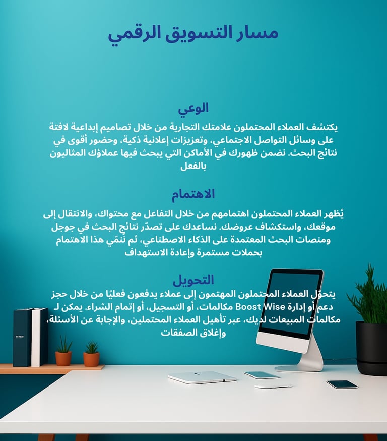 تمنحك Boost Wise استهدافًا ذكيًّا بالذكاء الاصطناعي، وحملات تسويقية مبتكرة، وإدارة كاملة لمكالمات المبيعات، لتصبح علامتك التجارية مصدرًا ثابتًا للعملاء الجدد.